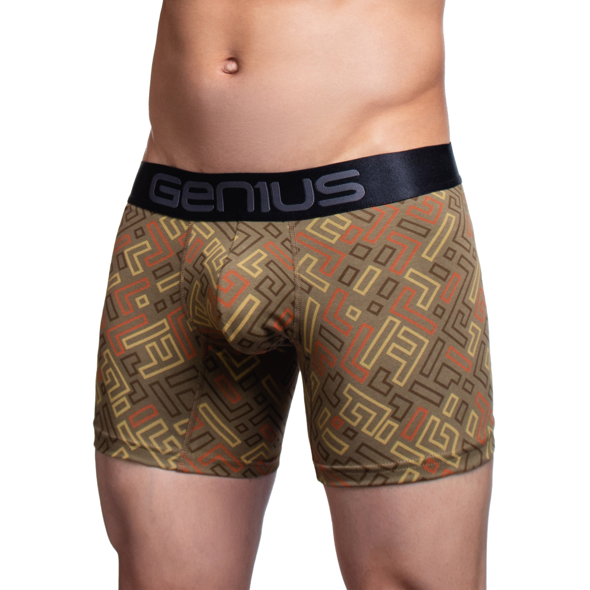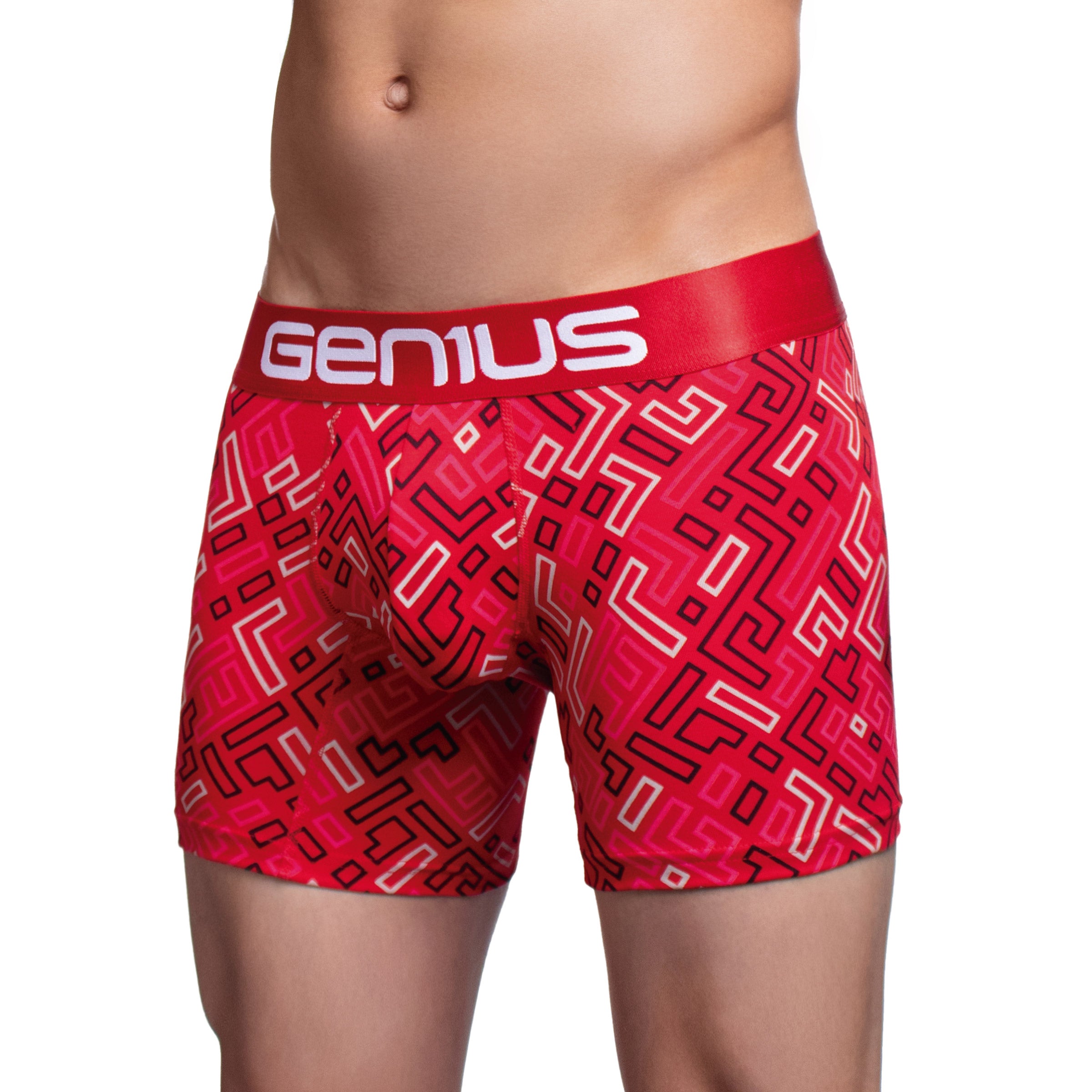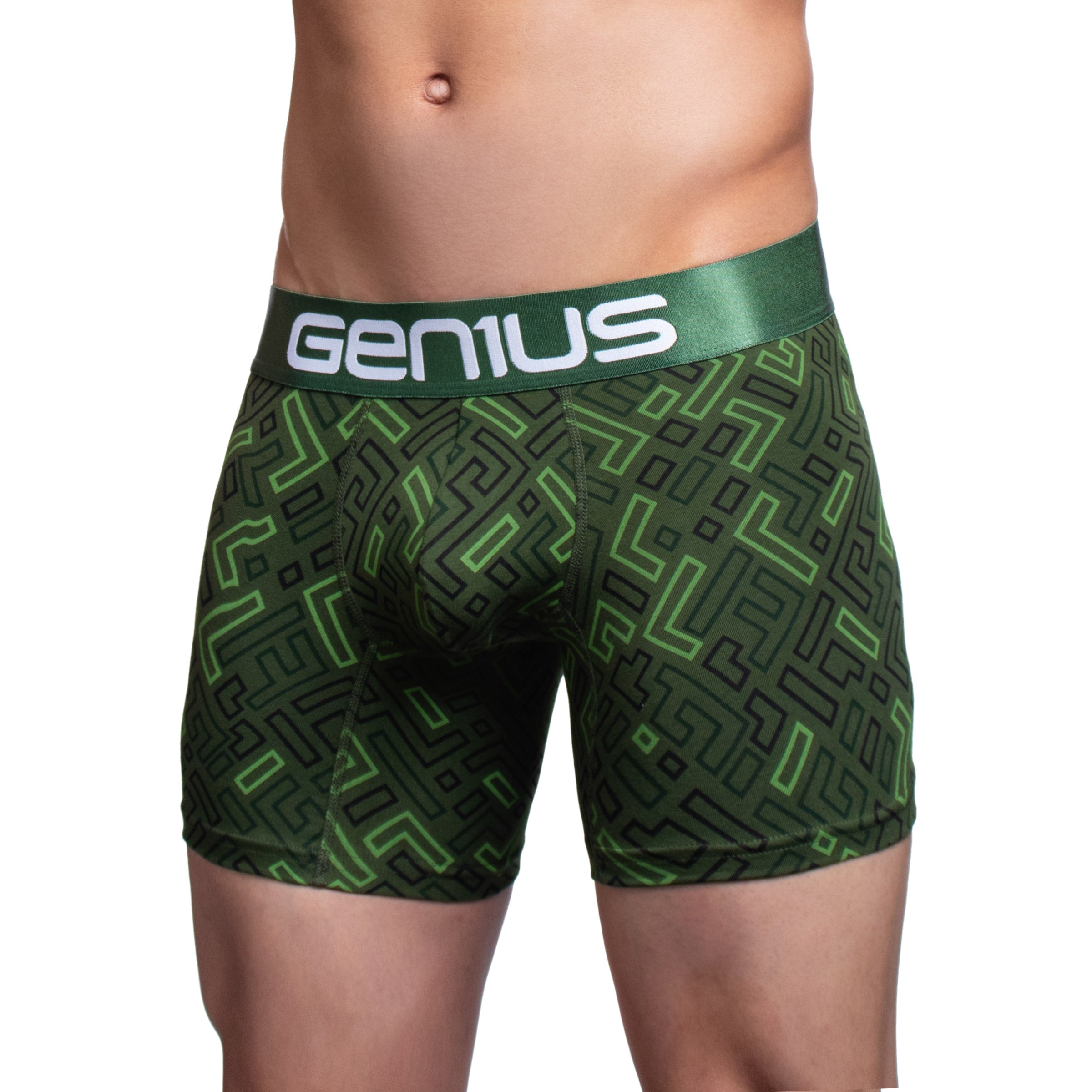Su estampado digital de alta definición en diseño tipo laberinto le da un look moderno y atrevido, disponible en combinaciones de colores vibrantes que no se desgastan con el uso ni las lavadas. La pretina elástica ultrasuave con el logo Genius asegura sujeción sin incomodidad, para que te sientas libre, seguro y con estilo todo el día.