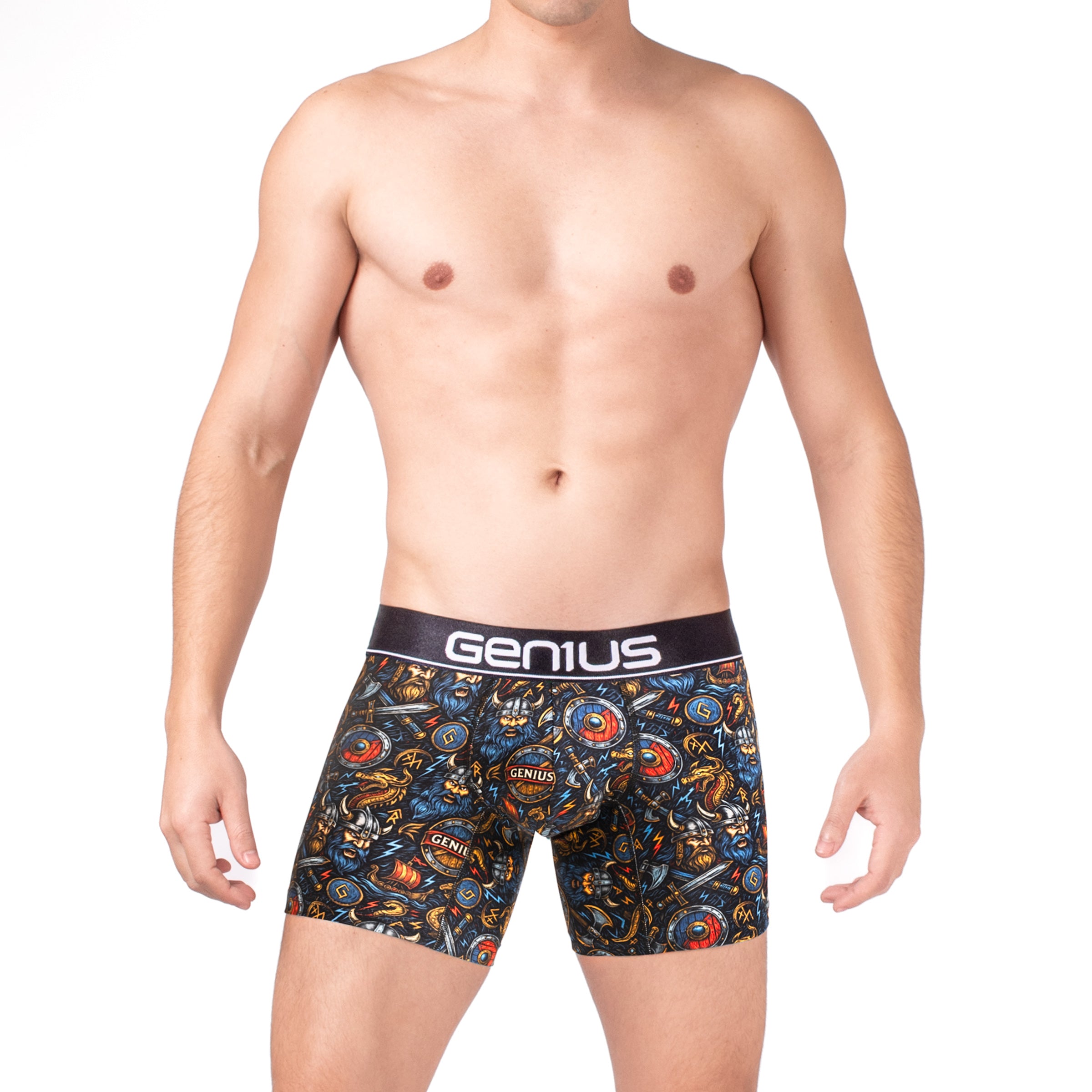 El bóxer para hombre Genius con estampado vikingo es una prenda diseñada para quienes buscan comodidad, personalidad y un estilo único en su ropa interior. Este diseño presenta un poderoso patrón inspirado en la cultura vikinga, donde aparecen guerreros nórdicos, escudos de batalla, espadas, runas y dragones, creando una composición intensa y llena de carácter.