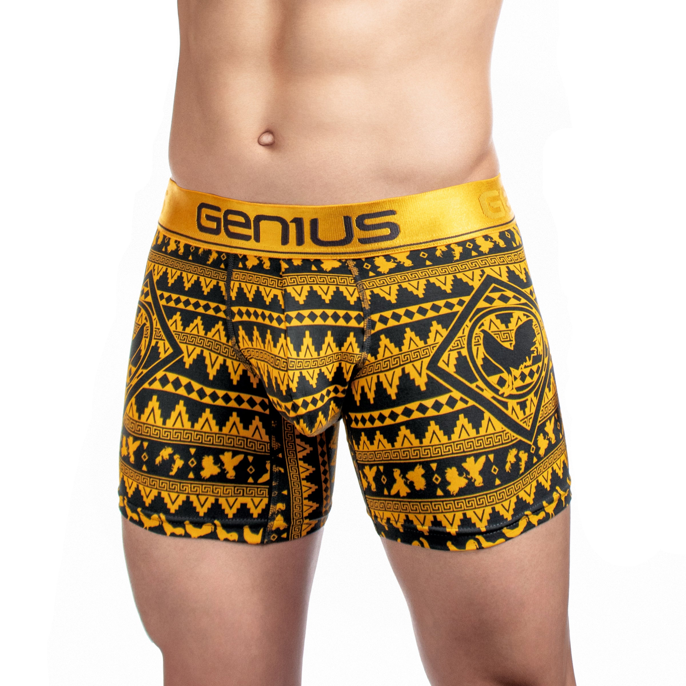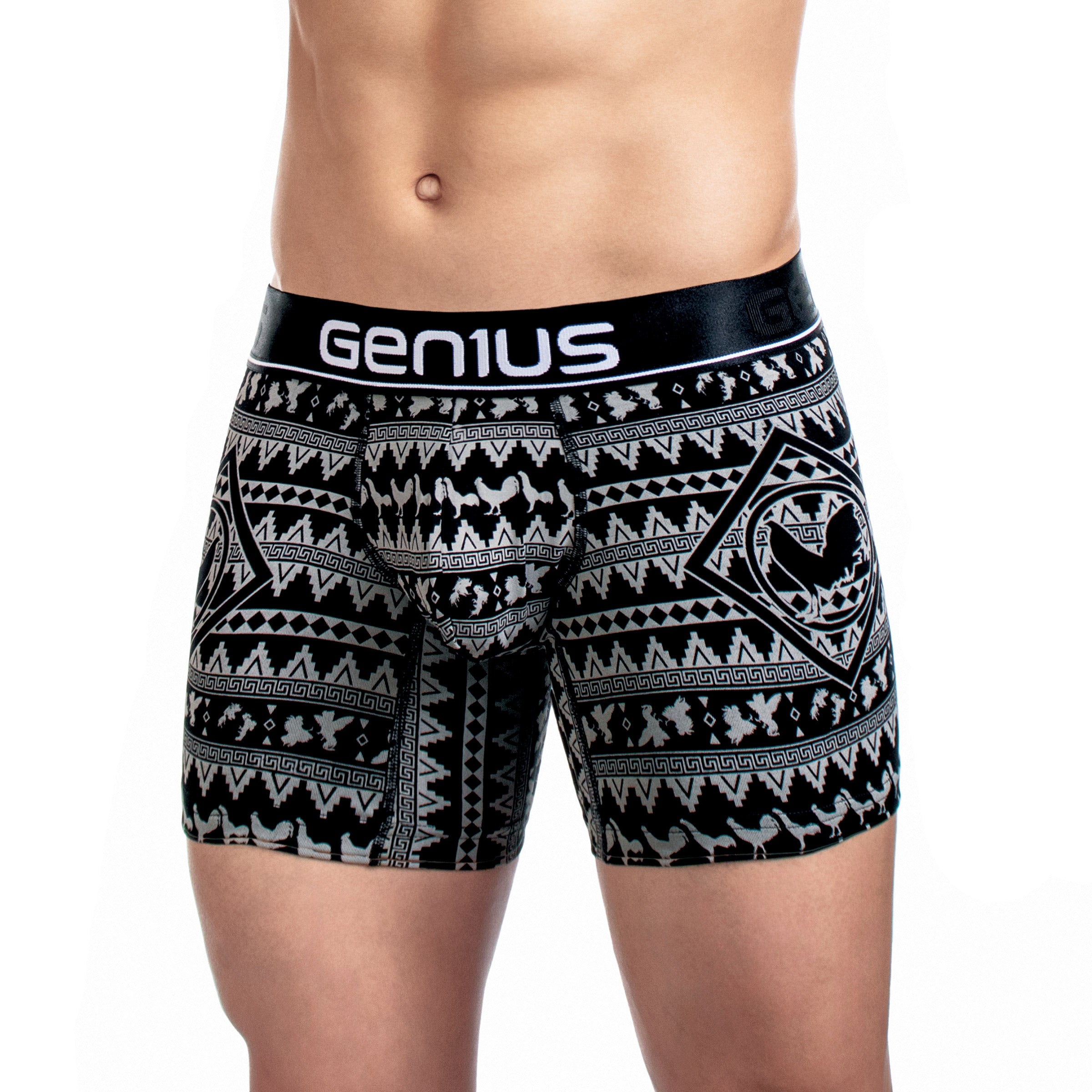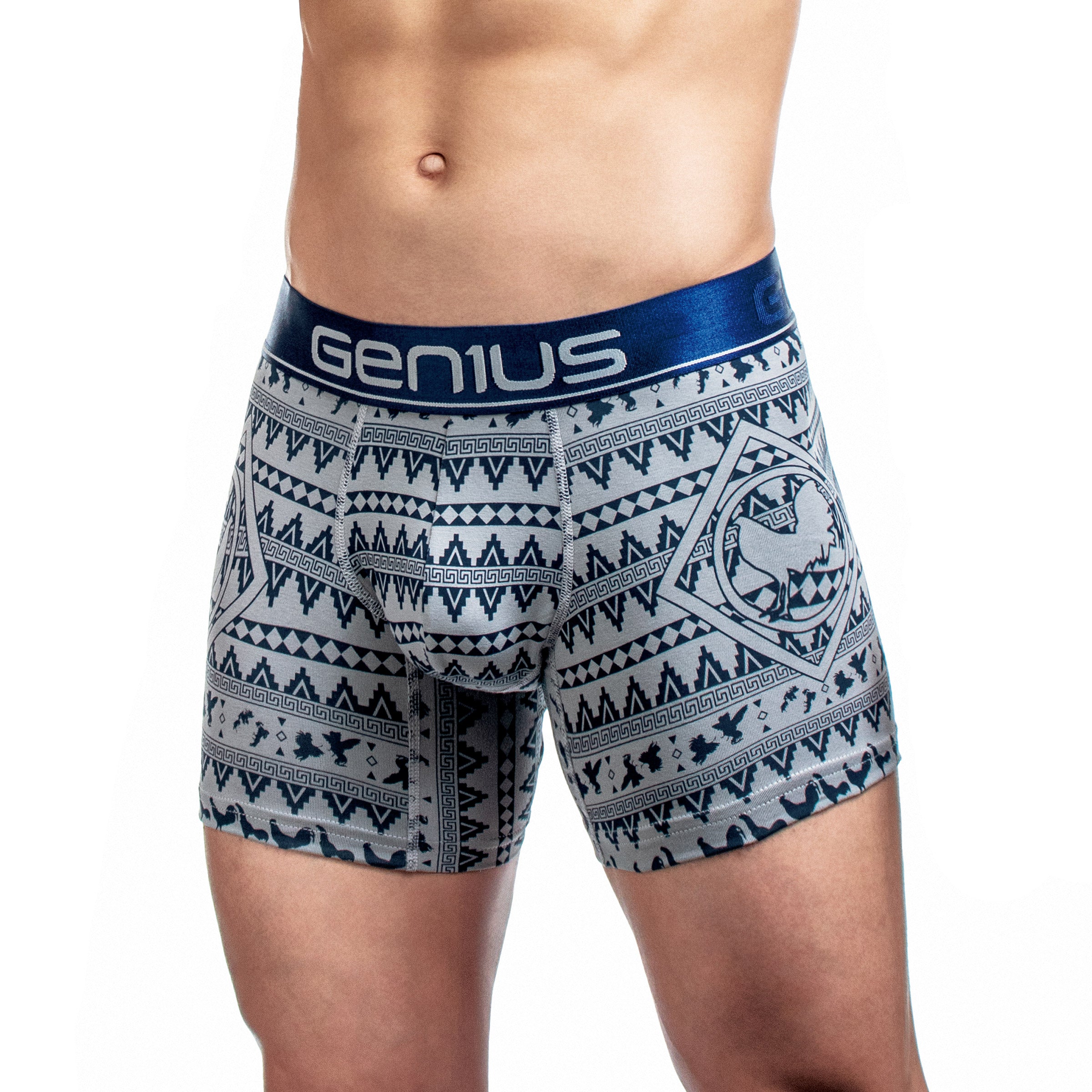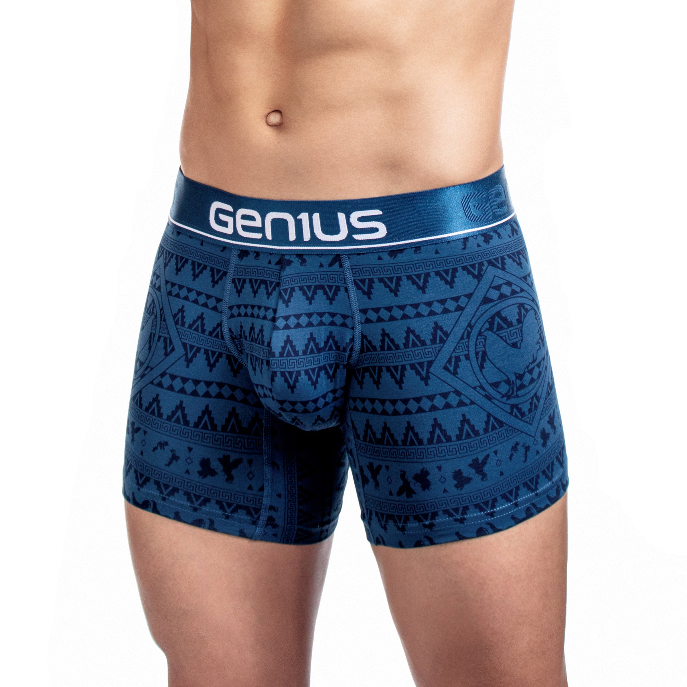 Su estampado digital premium con patrones étnicos geométricos le da un estilo auténtico y llamativo, disponible en una amplia gama de colores como azul, amarillo, negro, blanco, gris y rojo. La pretina elástica ultrasuave con el logo Genius asegura un calce firme sin incomodidad, para que disfrutes de comodidad premium y un look que destaca.